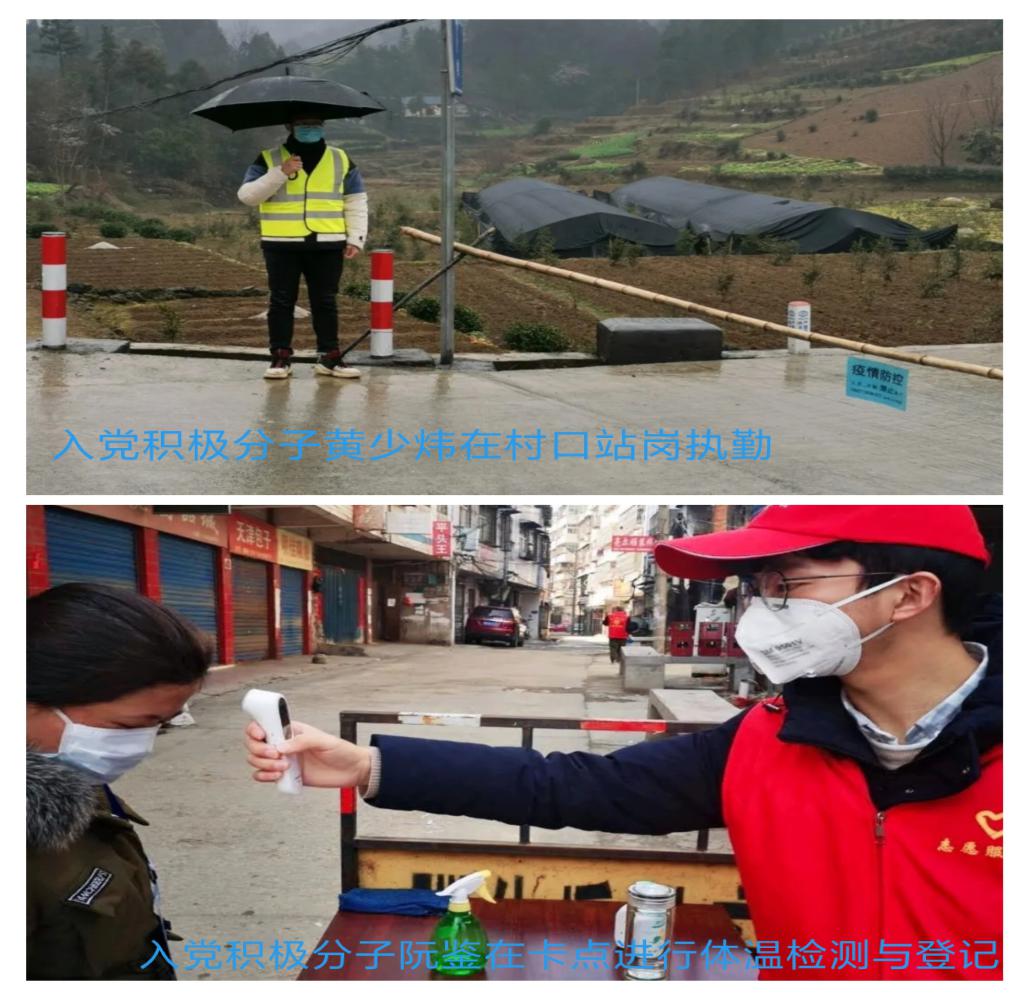 在党员的积极影响下,我院入党积极分子也踊跃加入到疫情防控的志愿服务中。国贸1942班黄少炜的老家在湖北省恩施州太阳河乡,当村里决定封村设卡时,他主动请缨,在卡点站岗执勤,对外来车辆进行劝返,对持有通行证的车辆进行放行,这样耐心劝阻、风里来雨里去的日子一直持续到学校正式上课以后才结束。事后他表示:“能够在国家危难时刻,贡献自己的一份绵薄之力,他感到十分荣幸。”经济1942班阮鉴也是此次基层疫情防控工作中的一名志愿者,服务于湖北省黄冈市红安县北岗门社区,承担着卡点体温检测和出行登记等工作,在志愿服务的过程中,他认真观察,主动学习,从一开始的手忙脚乱到后来的有条不紊,充分展现了当代大学生虚心学习,甘于奉献的美好品质。阮鉴在谈到自己参与志愿服务的初衷时说:“医护人员的前仆后继,舍生忘死深深感染了我,作为一名入党积极分子,我要向英雄们学习。”