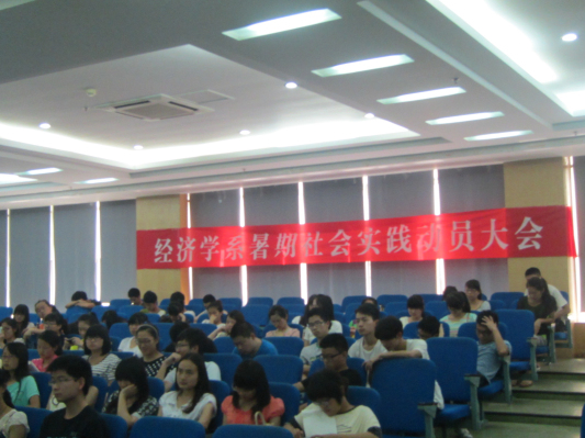 动员大会开始,由经济学系分团委书记丁升老师为同学们讲述了暑期社会实践的重要意义和经济学系在大学生社会实践方面的相关支持政策;大会第二个环节是介绍社会实践的规则与流程,由经济学系学生会实践部部长温立明、副部长向往主讲;大会第三个环节是由2013年荣获一等奖的实践团队队长李靖分享社会实践经验,并特邀校实践部前任部长陈瑞松详细讲解社会实践相关细节,并提出中肯意见和建议。